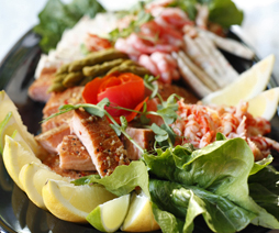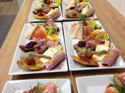 Varmrökt lax | Skagenfylld avacado | Laxpaté | Fläskfilé | Kycklingfilé | Kycklingspett | Lufttorkad skinka och melon | Brieost och vindruvor | Potatissallad och potatisgratäng.