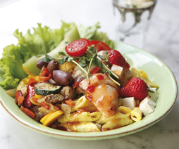Lufttorkad skinka och melon | Italienska köttbullar | Grillad kronärtskocka | Pastasallad med pesto | Ost- tomat- och lökpaj | Parmesanost och kryddstarka korvar | Kycklingfile med bacon och mozzarella | Ostbricka med druvor, oliver, grissini, kex och salami.